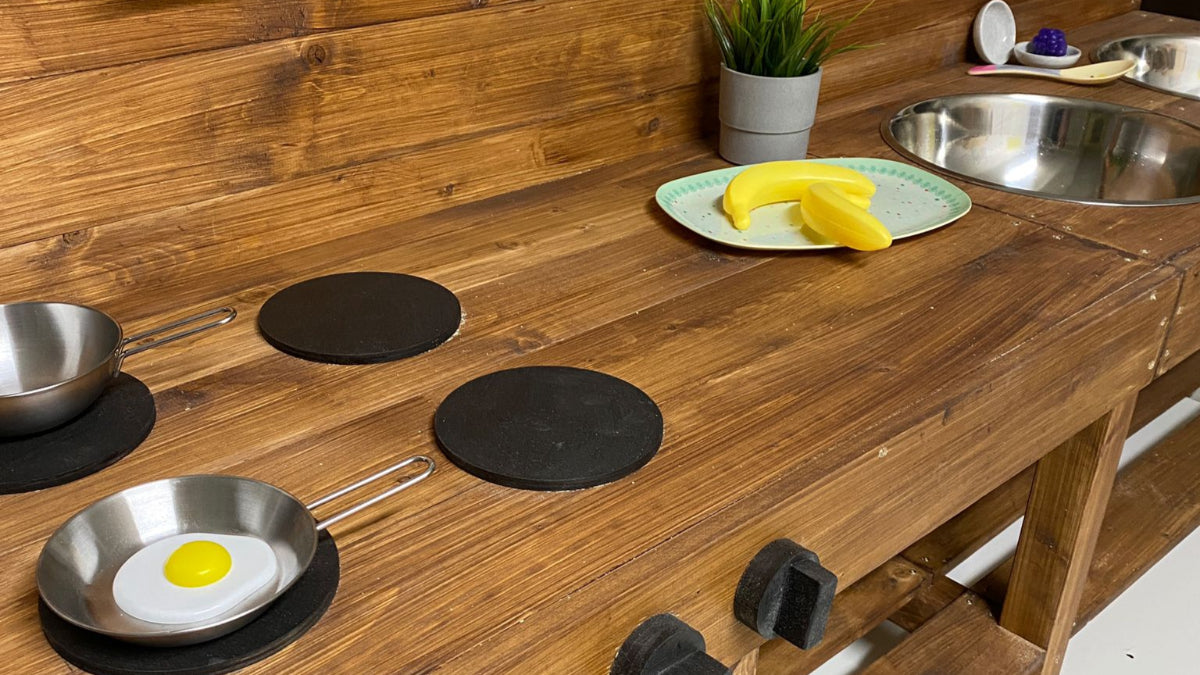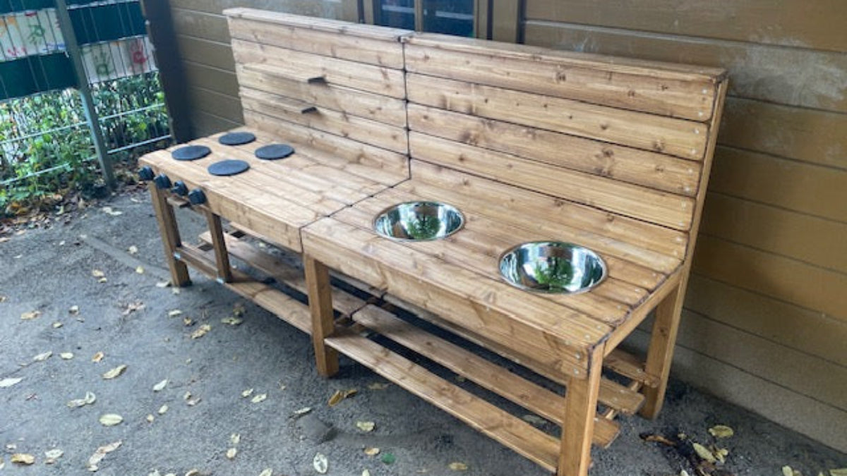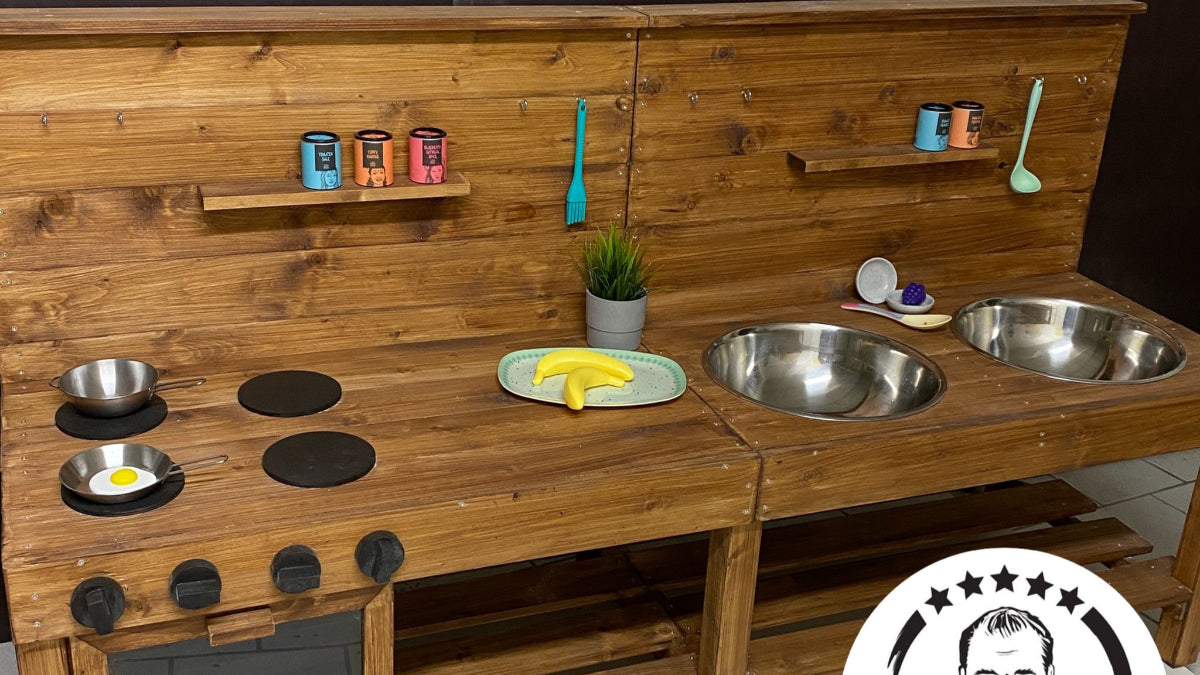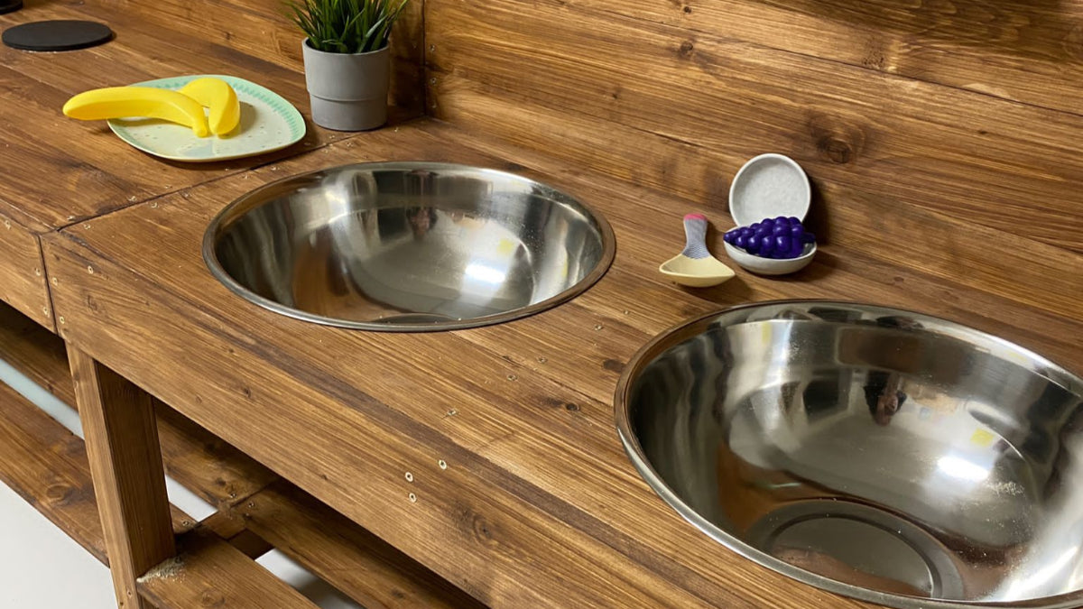 Die große Outdoor Matschküche Lena von Tommywood ist die perfekte langlebige und robuste Garten-Spielküche für kreatives Spielen im Freien. Diese hochwertige Holz-Matschküche aus FSC-zertifiziertem nordischem Fichtenholz bietet mit ihren großen Schüsseln und dem integrierten Backofen ein komplettes Outdoor-Kocherlebnis.