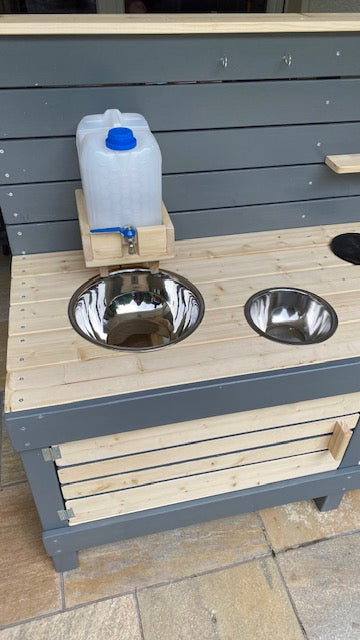 Die XXL Matschküche wird als 5-teiliger Bausatz mit vorgebohrten Löchern geliefert. Sie benötigen nur ein Werkzeug für die kinderleichte Montage.