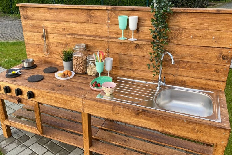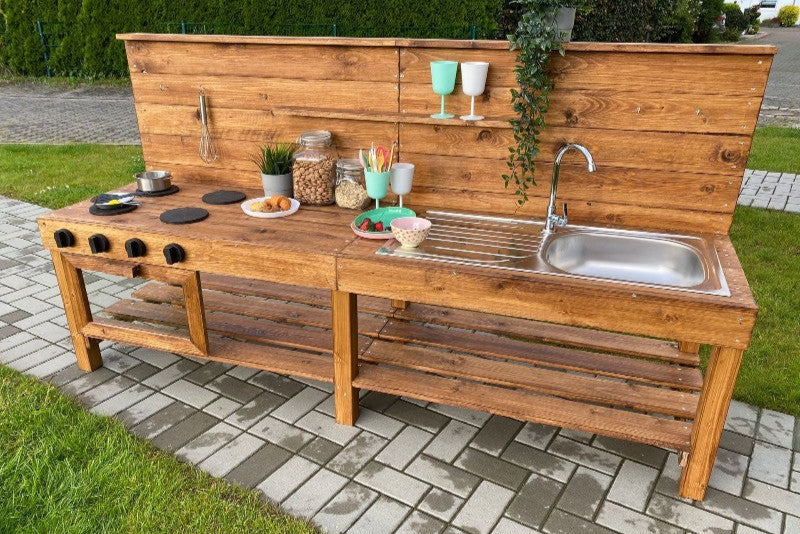 Die XXL Outdoor Matschküche Luca von Tommywood ist die perfekte wetterfeste Kindergarten Sandküche für professionelle Ansprüche. Diese hochwertige XXL Outdoor-Küche aus robustem Holz bietet mit ihren großzügigen Maßen und der umfangreichen Ausstattung das ultimative Spielerlebnis für Kindergärten und große Gärten.